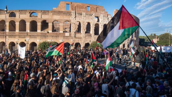 Para demonstran telah mendekati gerbang pusat pelatihan Italia di Florence pekan lalu untuk menuntut agar pertandingan tidak dimainkan karena perang di Gaza — bagian dari aksi mogok nasional yang melibatkan jutaan aktivis di jalan.
